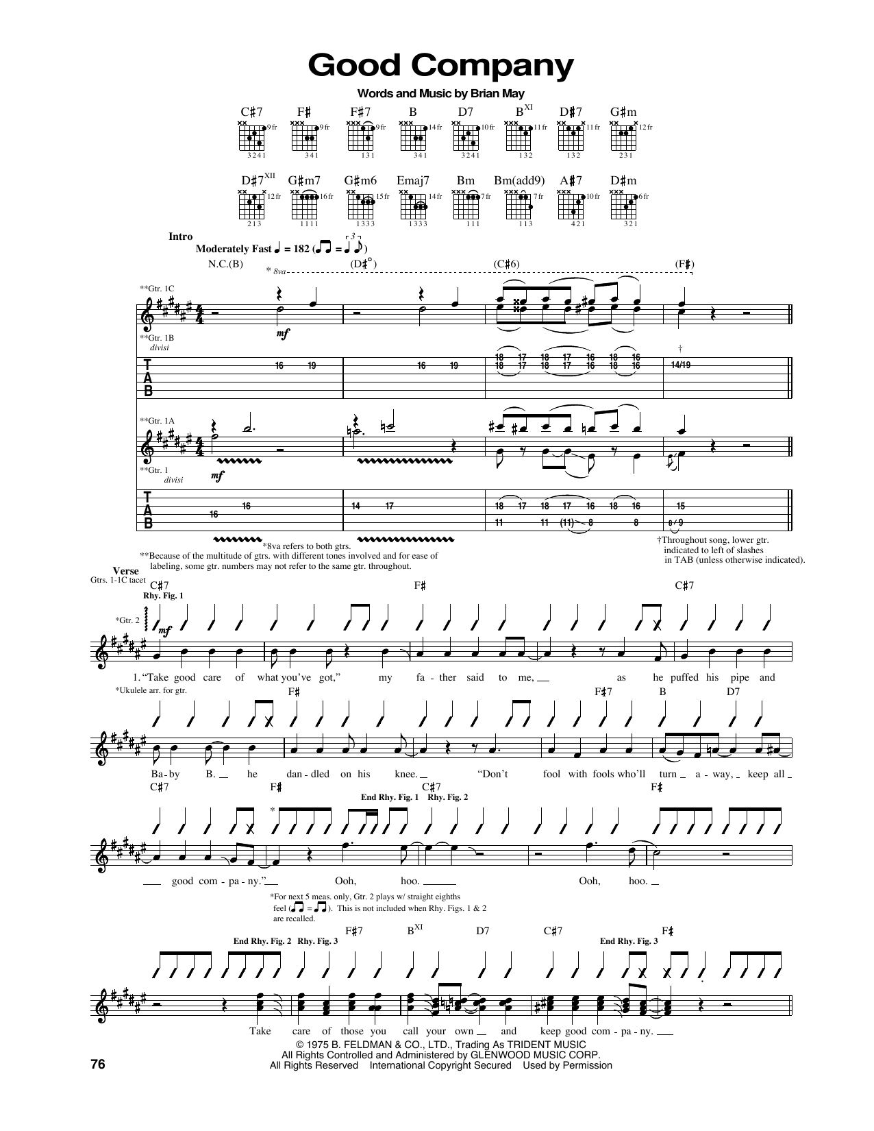 Download or print Queen Good Company sheet music, chords and digital score arranged for Guitar Chords/Lyrics. This Rock score includes 3 page(s).