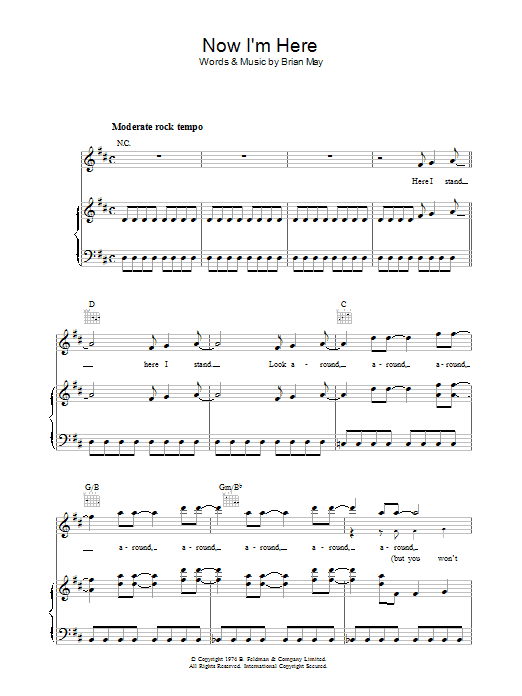 Download or print Queen Now I'm Here sheet music, chords and digital score arranged for Piano, Vocal & Guitar Chords. This Rock score includes 9 page(s).