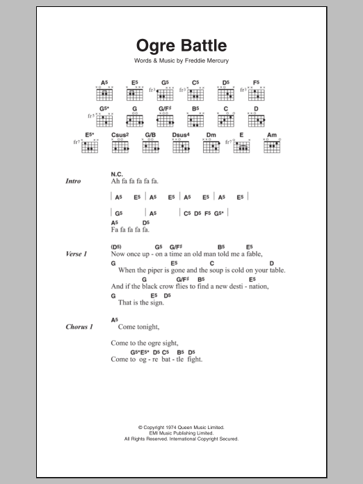 Download or print Queen Ogre Battle sheet music, chords and digital score arranged for Guitar Chords/Lyrics. This Rock score includes 3 page(s).