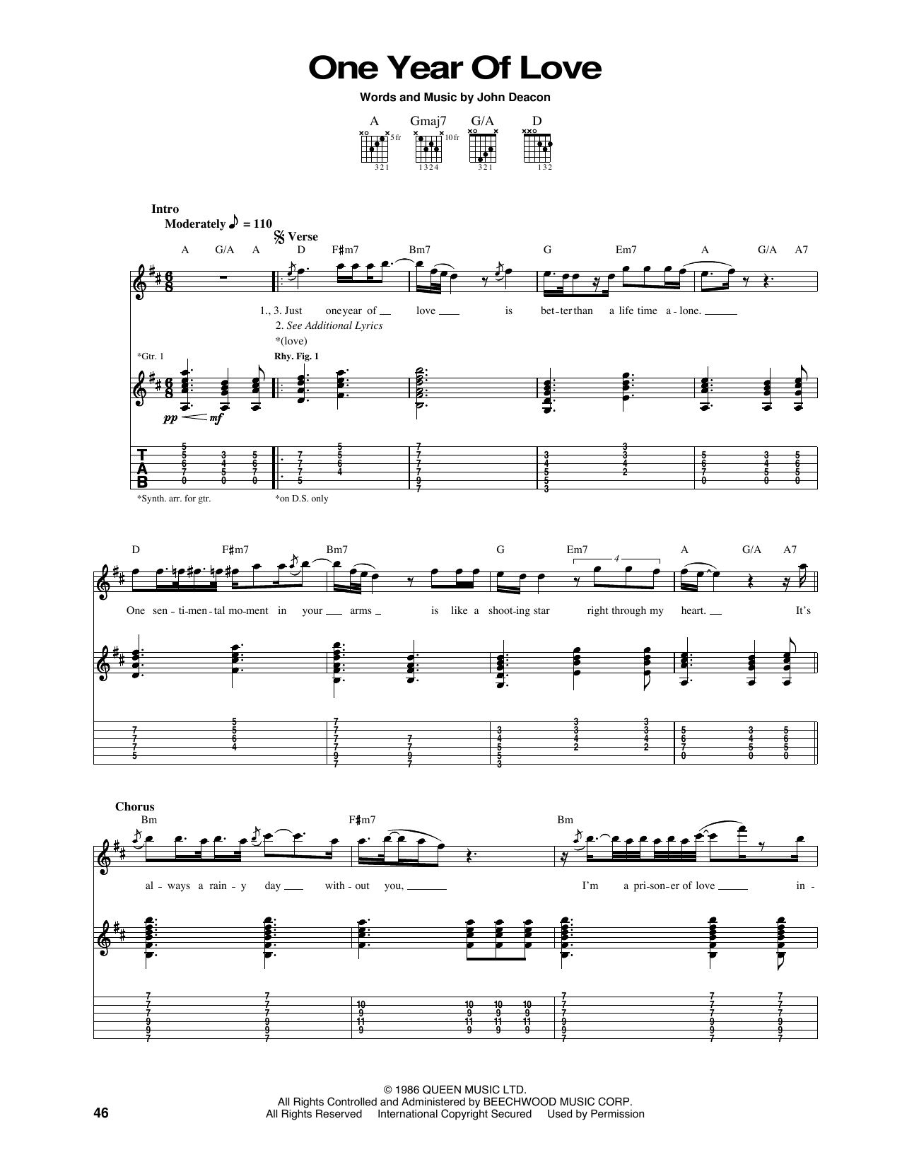 Download or print Queen One Year Of Love sheet music, chords and digital score arranged for Guitar Tab. This Pop score includes 4 page(s).