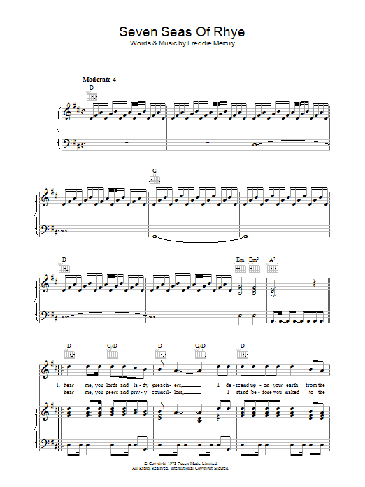 Download or print Queen Seven Seas Of Rhye sheet music, chords and digital score arranged for Piano, Vocal & Guitar Chords. This Rock score includes 6 page(s).