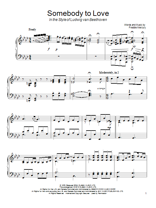 Download or print Queen Somebody To Love (in the style of Ludwig van Beethoven) sheet music, chords and digital score arranged for Piano Solo. This Classical score includes 8 page(s).