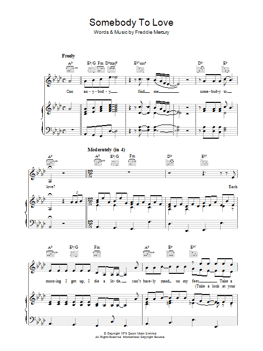 Download or print Queen Somebody To Love sheet music, chords and digital score arranged for Guitar Tab. This Pop score includes 18 page(s).