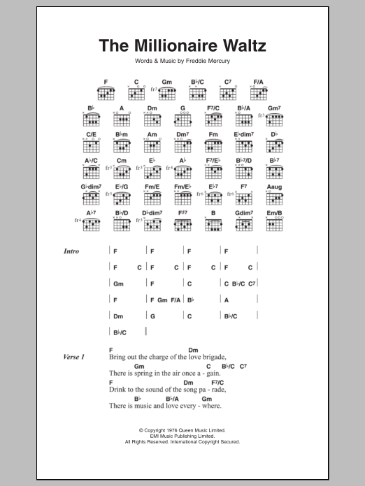 Download or print Queen The Millionaire Waltz sheet music, chords and digital score arranged for Guitar Chords/Lyrics. This Rock score includes 4 page(s).
