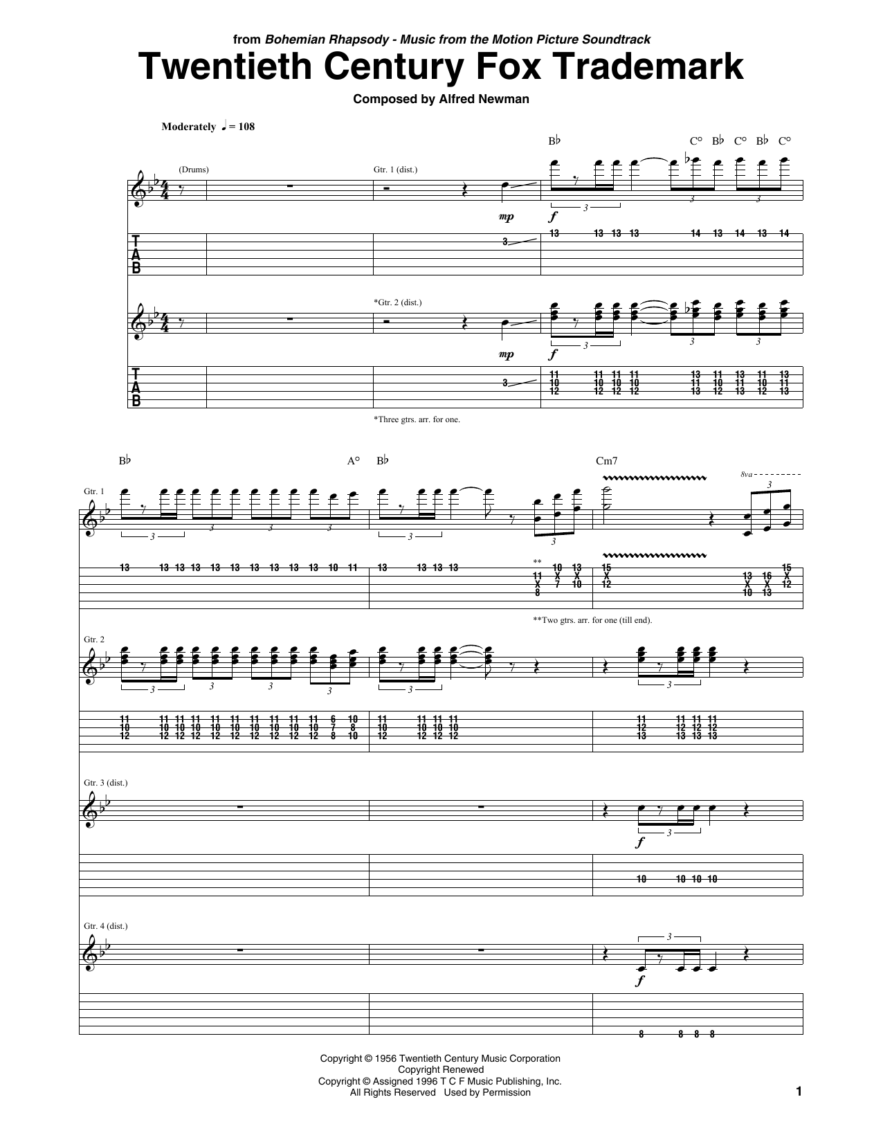 Download or print Queen Twentieth Century Fox Trademark sheet music, chords and digital score arranged for Guitar Tab. This Pop score includes 2 page(s).