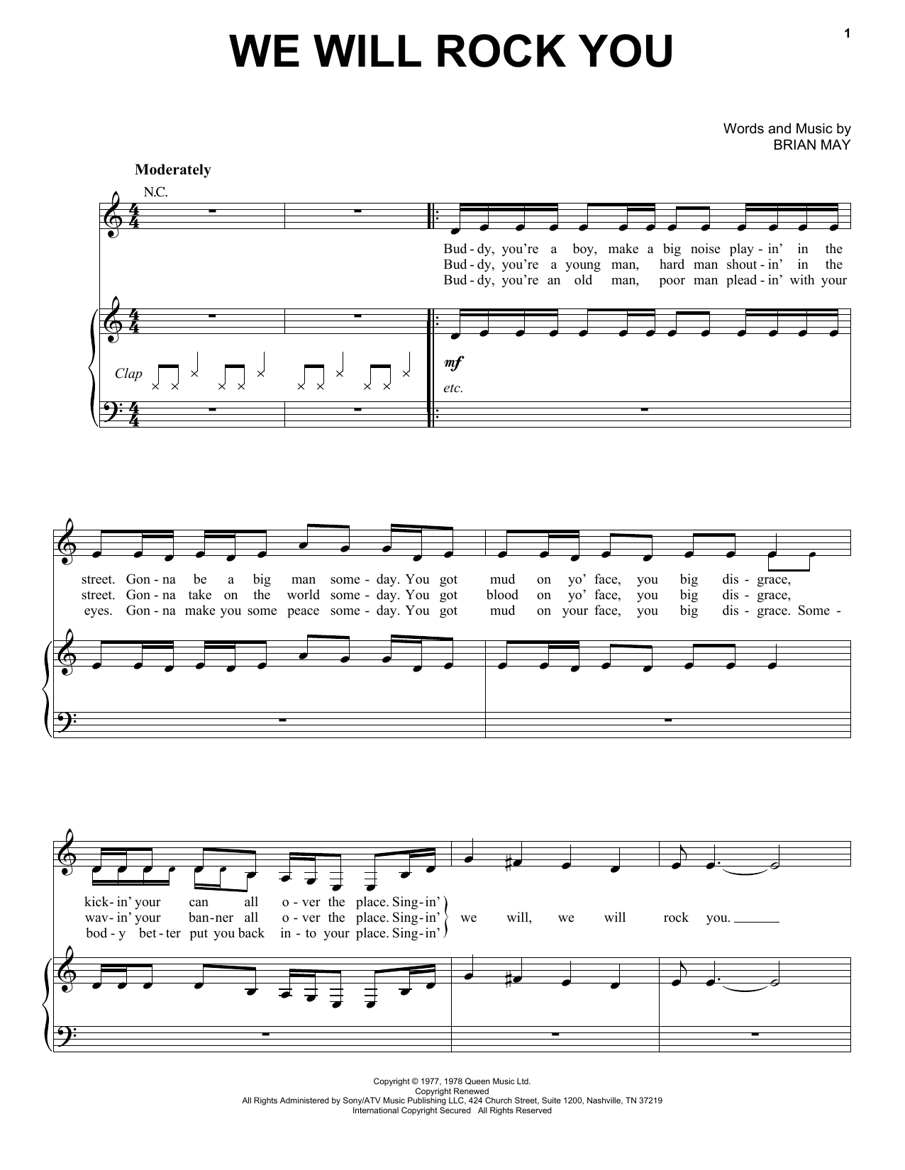Download or print Queen We Will Rock You sheet music, chords and digital score arranged for Piano, Vocal & Guitar Chords (Right-Hand Melody). This Pop score includes 2 page(s).