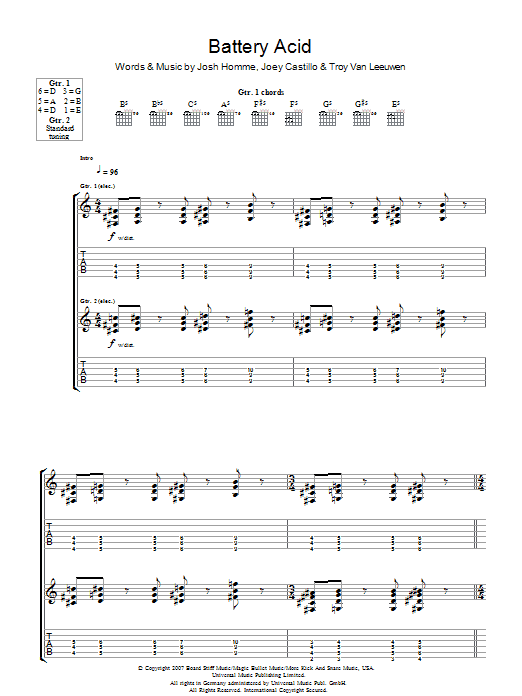Download or print Queens Of The Stone Age Battery Acid sheet music, chords and digital score arranged for Guitar Tab. This Metal score includes 10 page(s).