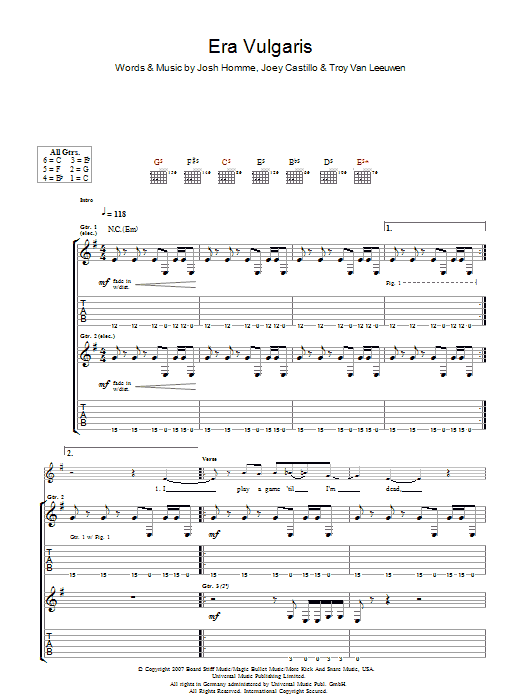 Download or print Queens Of The Stone Age Era Vulgaris sheet music, chords and digital score arranged for Guitar Tab. This Metal score includes 10 page(s).