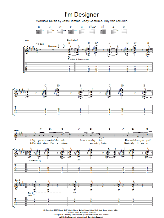 Download or print Queens Of The Stone Age I'm Designer sheet music, chords and digital score arranged for Guitar Tab. This Metal score includes 12 page(s).