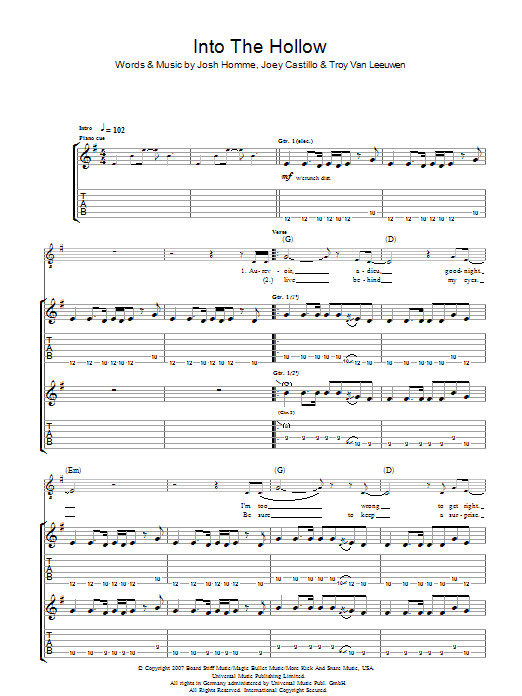 Download or print Queens Of The Stone Age Into The Hollow sheet music, chords and digital score arranged for Guitar Tab. This Metal score includes 6 page(s).