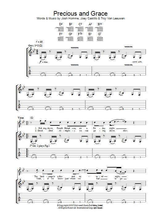 Download or print Queens Of The Stone Age Precious And Grace sheet music, chords and digital score arranged for Guitar Tab. This Metal score includes 7 page(s).