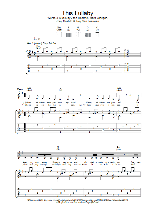 Download or print Queens Of The Stone Age This Lullaby sheet music, chords and digital score arranged for Guitar Tab. This Metal score includes 2 page(s).
