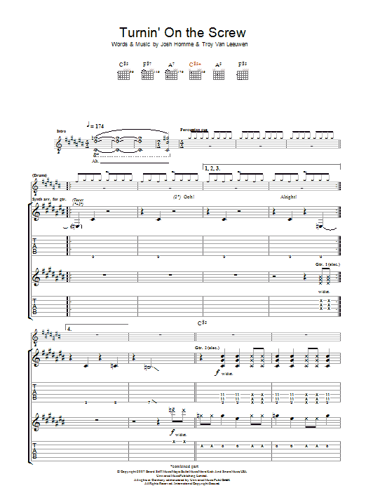 Download or print Queens Of The Stone Age Turnin' On The Screw sheet music, chords and digital score arranged for Guitar Tab. This Metal score includes 11 page(s).