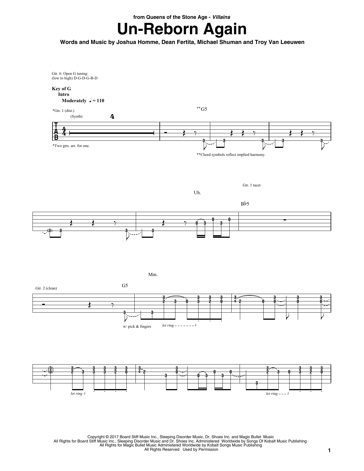 Download or print Queens Of The Stone Age Un-Reborn Again sheet music, chords and digital score arranged for Guitar Rhythm Tab. This Pop score includes 10 page(s).