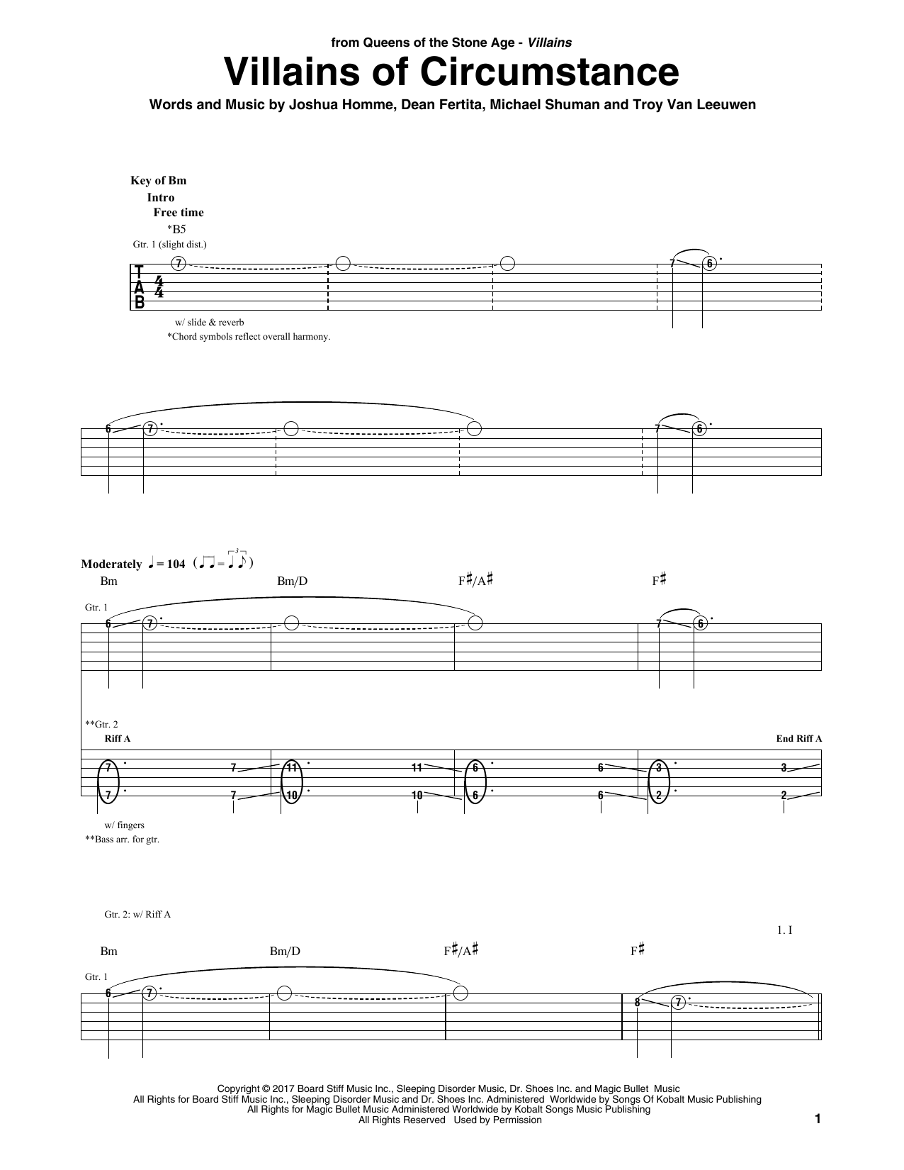 Download or print Queens Of The Stone Age Villains Of Circumstance sheet music, chords and digital score arranged for Guitar Rhythm Tab. This Pop score includes 9 page(s).