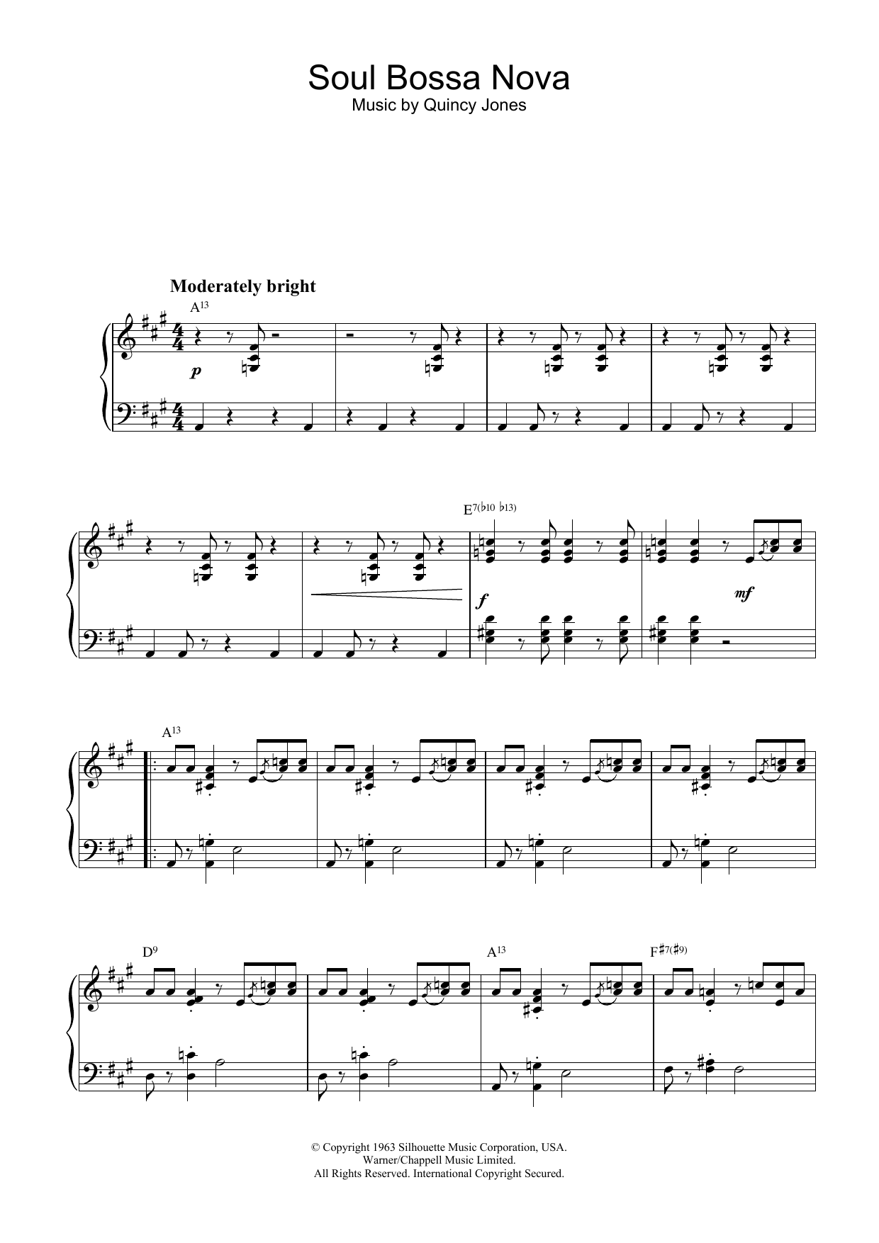 Download or print Quincy Jones Soul Bossa Nova sheet music, chords and digital score arranged for Piano Solo. This Jazz score includes 4 page(s).