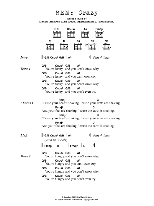 Download or print R.E.M. Crazy sheet music, chords and digital score arranged for Guitar Chords/Lyrics. This Rock score includes 2 page(s).