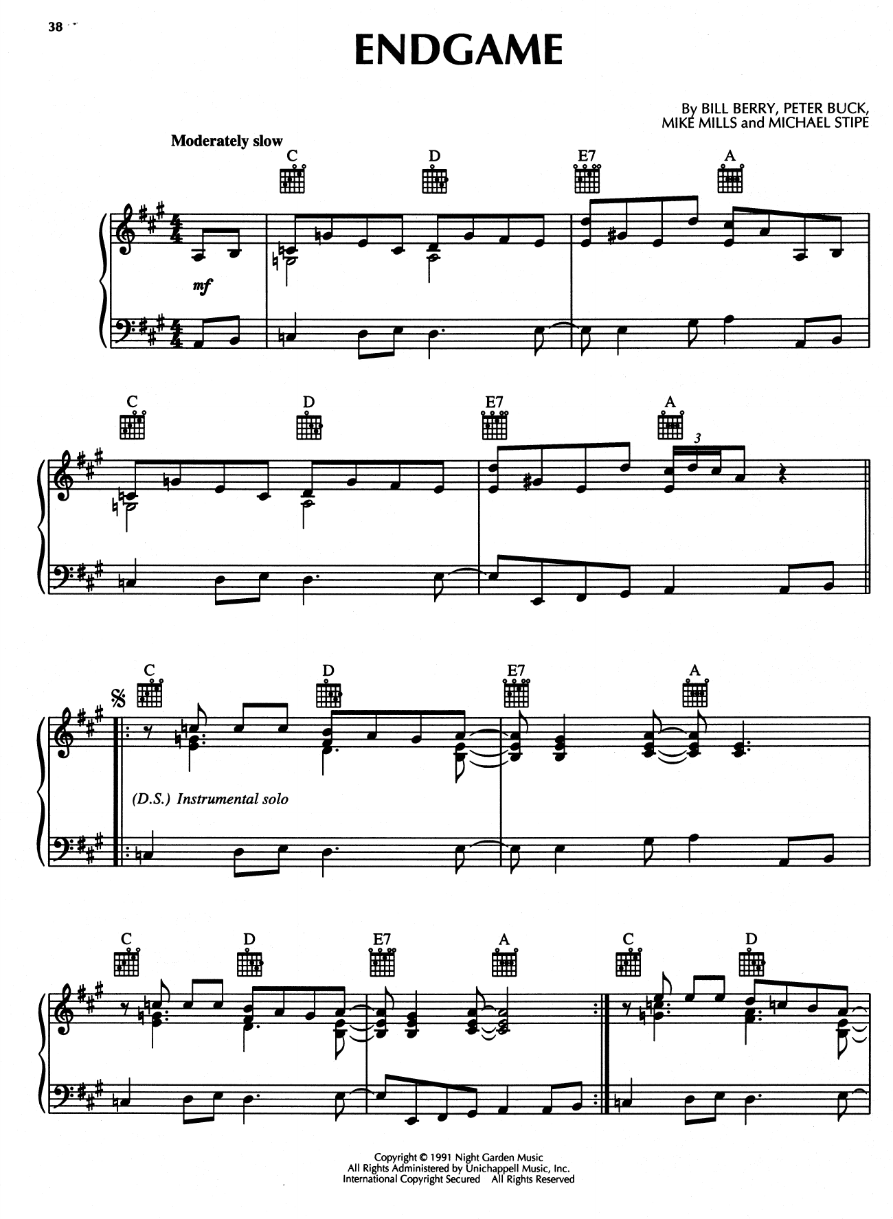 Download or print R.E.M. Endgame sheet music, chords and digital score arranged for Piano Solo. This Alternative score includes 4 page(s).