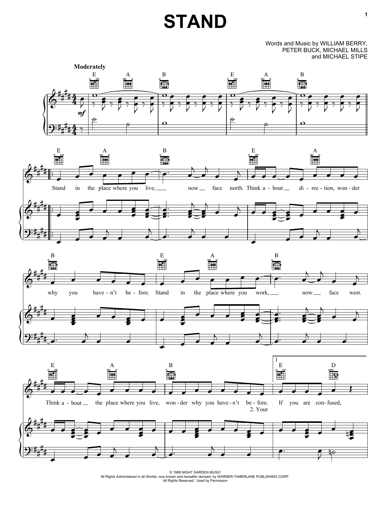 Download or print R.E.M. Stand sheet music, chords and digital score arranged for Piano, Vocal & Guitar Chords (Right-Hand Melody). This Alternative score includes 5 page(s).