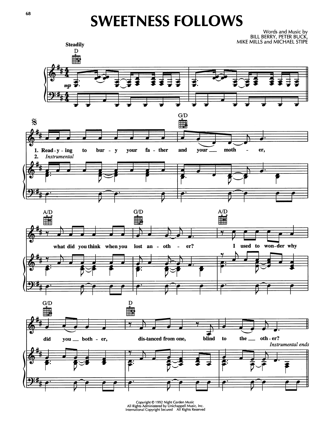 Download or print R.E.M. Sweetness Follows sheet music, chords and digital score arranged for Piano, Vocal & Guitar Chords (Right-Hand Melody). This Jazz score includes 5 page(s).