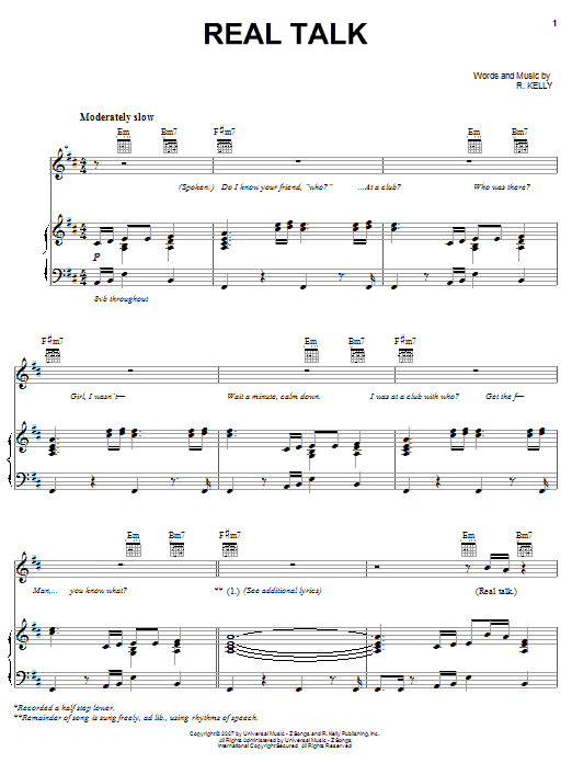 Download or print R Kelly Real Talk sheet music, chords and digital score arranged for Piano, Vocal & Guitar Chords (Right-Hand Melody). This Pop score includes 5 page(s).
