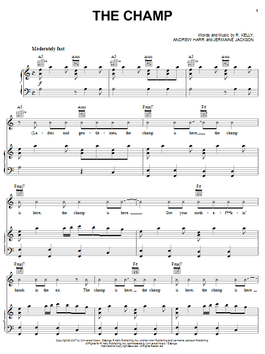 Download or print R Kelly The Champ sheet music, chords and digital score arranged for Piano, Vocal & Guitar Chords (Right-Hand Melody). This Pop score includes 9 page(s).