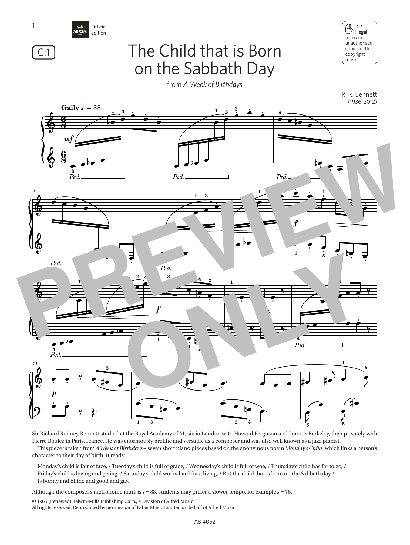 Download or print R R Bennett The Child that Is Born on the Sabbath Day (Grade 6, list C1, from ABRSM Piano Syllabus 2023 & 2024) sheet music, chords and digital score arranged for Piano Solo. This Classical score includes 2 page(s).