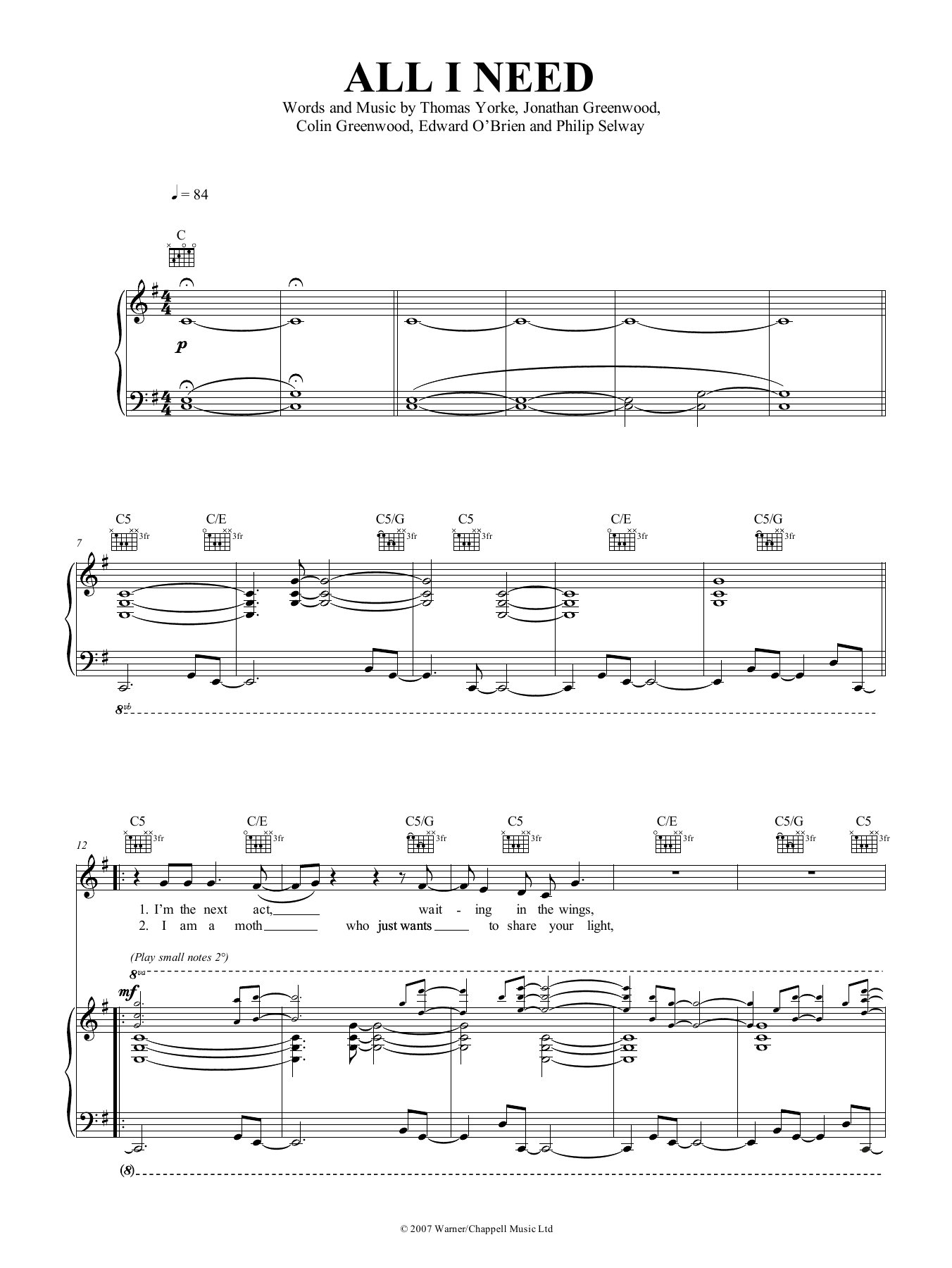 Download or print Radiohead All I Need sheet music, chords and digital score arranged for Piano Solo. This Pop score includes 4 page(s).