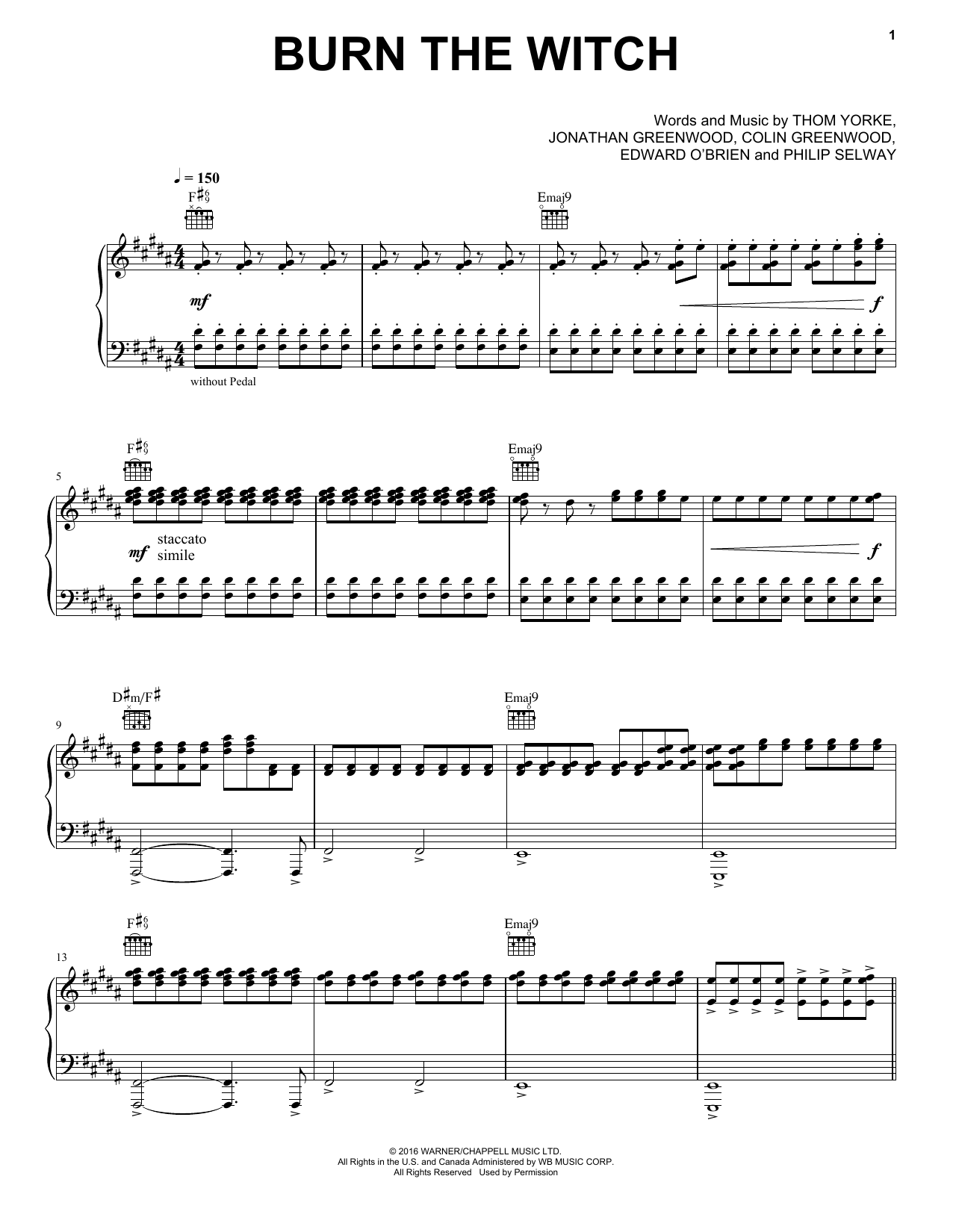 Download or print Radiohead Burn The Witch sheet music, chords and digital score arranged for Piano, Vocal & Guitar Chords (Right-Hand Melody). This Pop score includes 10 page(s).