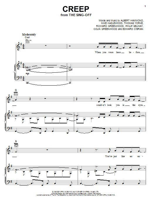 Download or print Radiohead Creep (as performed on The Sing-Off) sheet music, chords and digital score arranged for Piano, Vocal & Guitar Chords (Right-Hand Melody). This Alternative score includes 8 page(s).