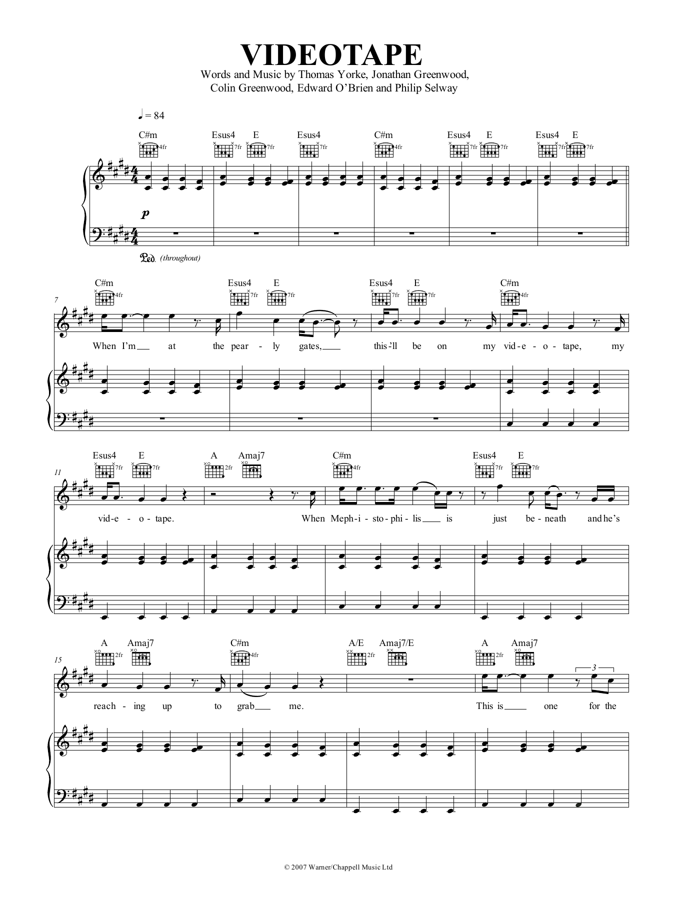 Download or print Radiohead Videotape sheet music, chords and digital score arranged for Piano, Vocal & Guitar Chords (Right-Hand Melody). This Rock score includes 4 page(s).