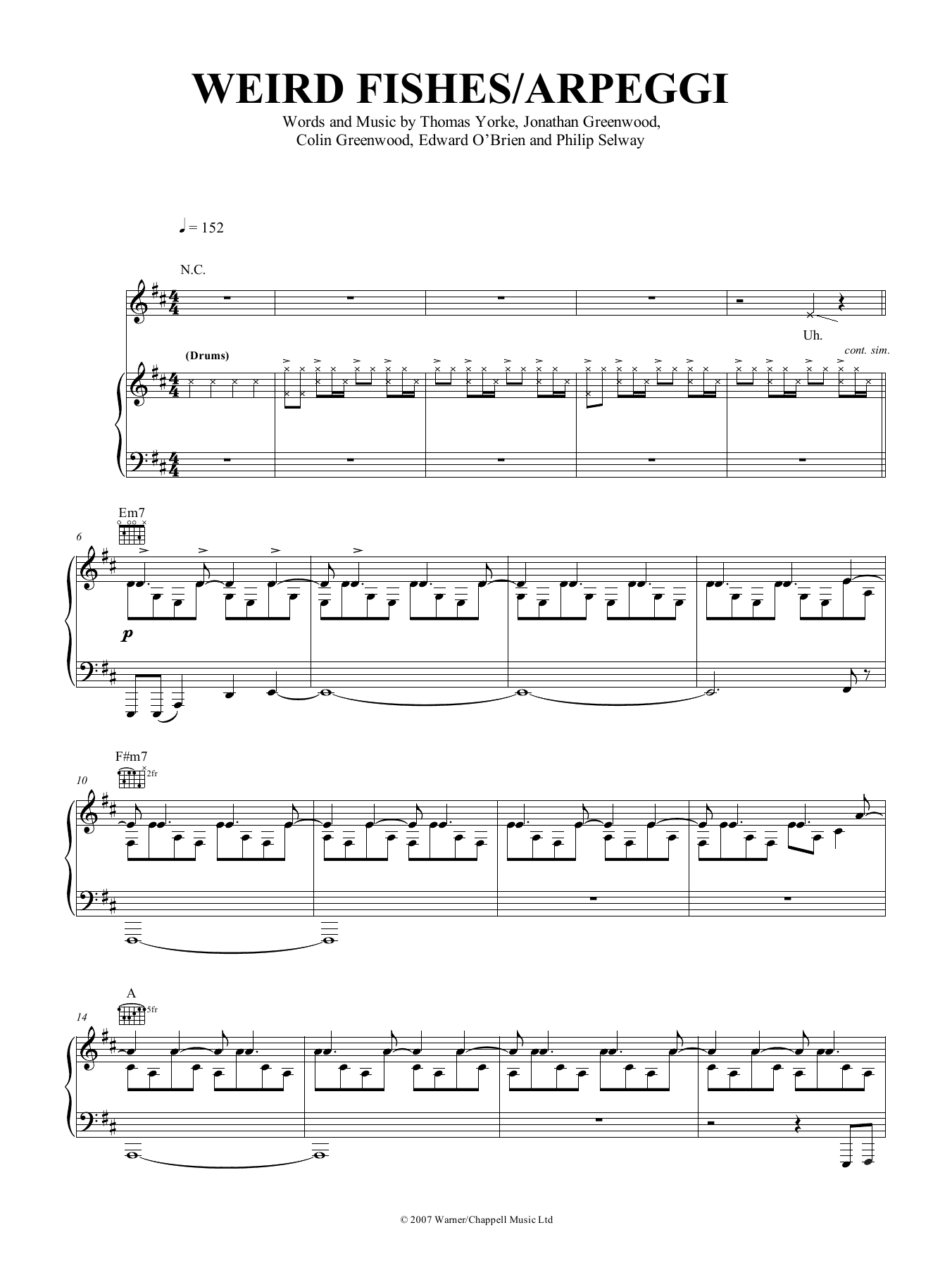 Download or print Radiohead Weird Fishes/Arpeggi sheet music, chords and digital score arranged for Guitar Tab. This Pop score includes 20 page(s).