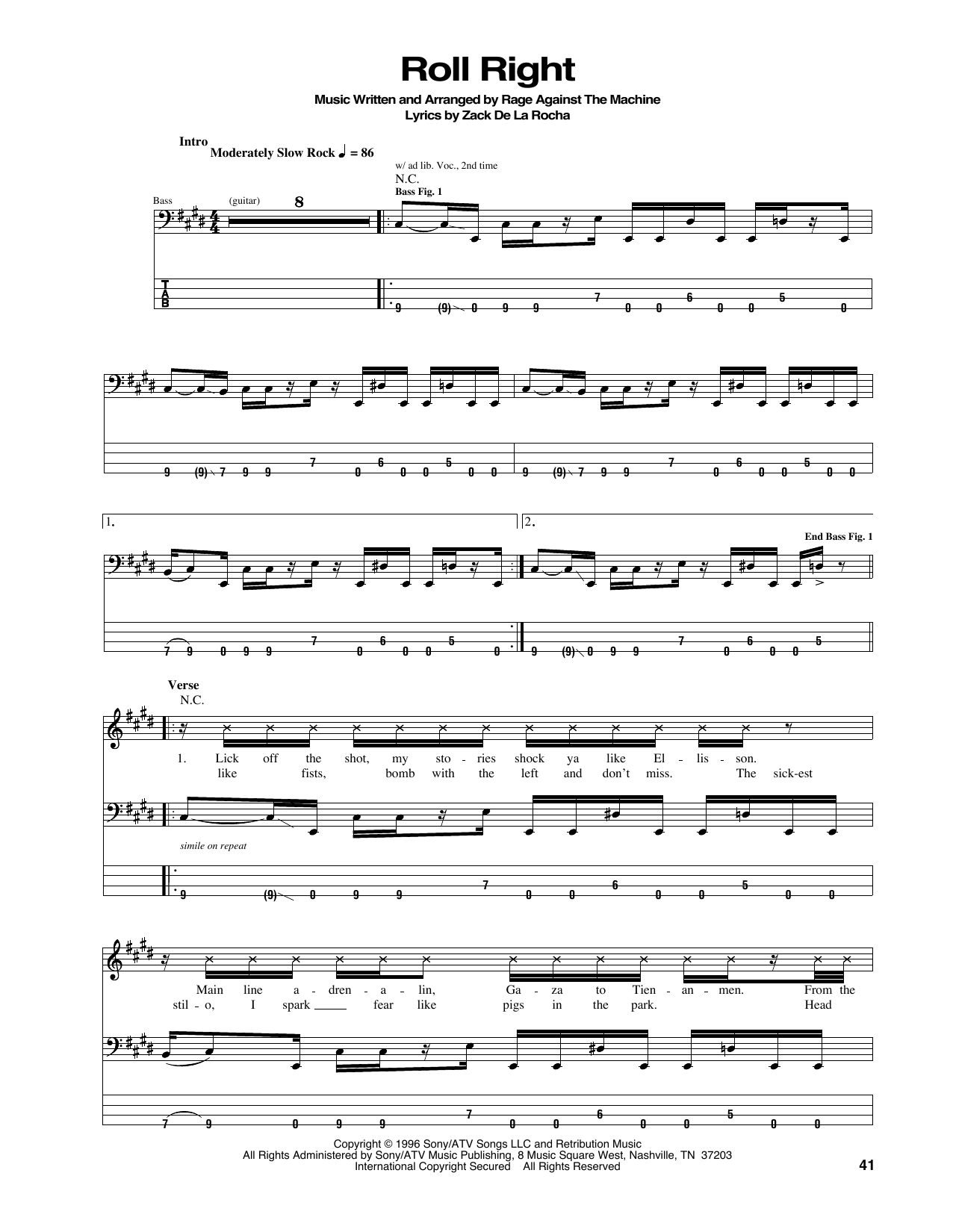 Download or print Rage Against The Machine Roll Right sheet music, chords and digital score arranged for Bass Guitar Tab. This Rock score includes 4 page(s).