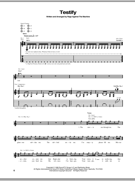Download or print Rage Against The Machine Testify sheet music, chords and digital score arranged for Guitar Tab. This Metal score includes 4 page(s).