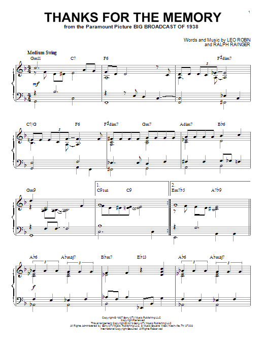 Download or print Ralph Rainger Thanks For The Memory (arr. Brent Edstrom) sheet music, chords and digital score arranged for Piano Solo. This Jazz score includes 4 page(s).