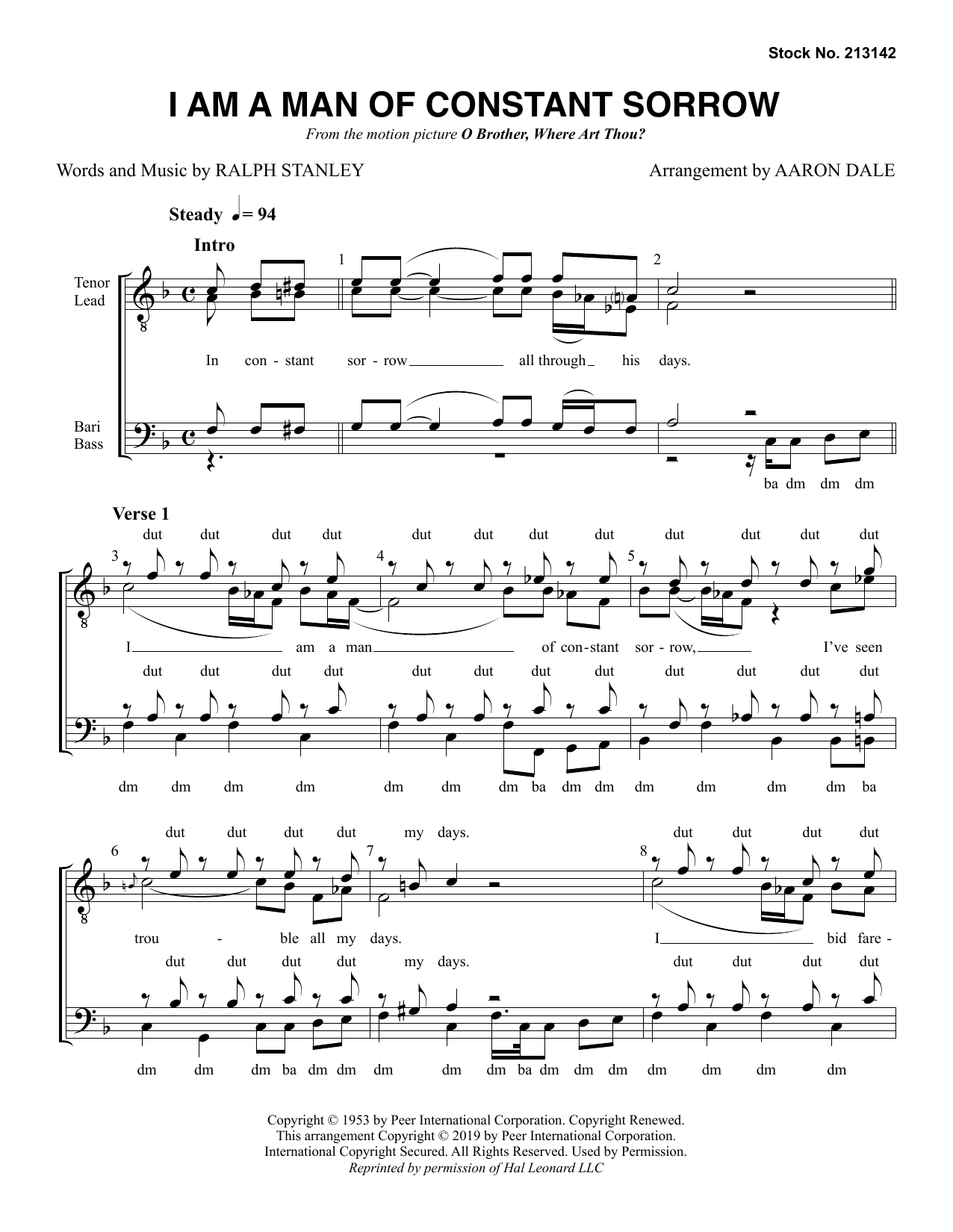 Download or print Ralph Stanley I Am A Man Of Constant Sorrow (arr. Aaron Dale) sheet music, chords and digital score arranged for TTBB Choir. This Barbershop score includes 4 page(s).