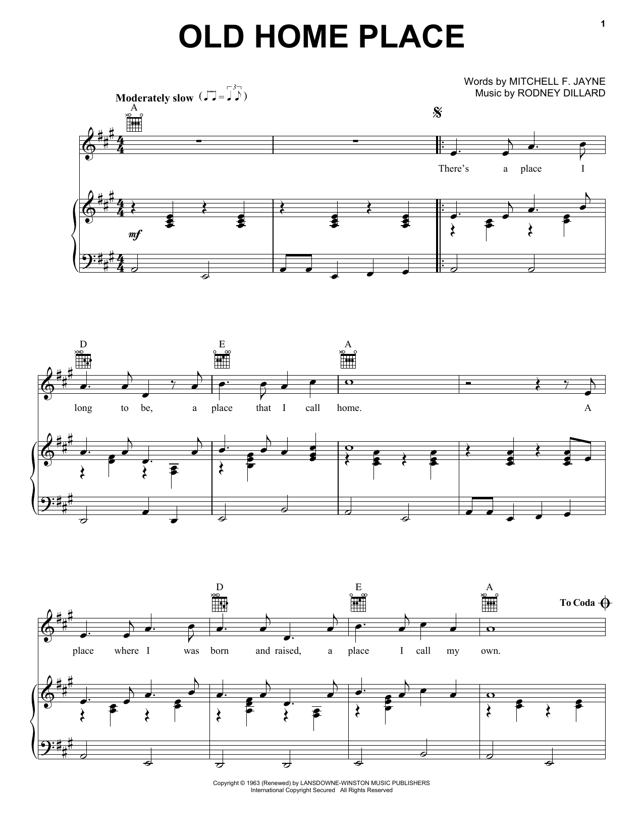 Download or print Ralph Stanley Old Home Place sheet music, chords and digital score arranged for Piano, Vocal & Guitar Chords (Right-Hand Melody). This Country score includes 2 page(s).