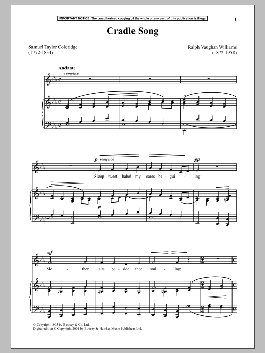 Download or print Ralph Vaughan Williams Cradle Song sheet music, chords and digital score arranged for Piano & Vocal. This Folk score includes 3 page(s).