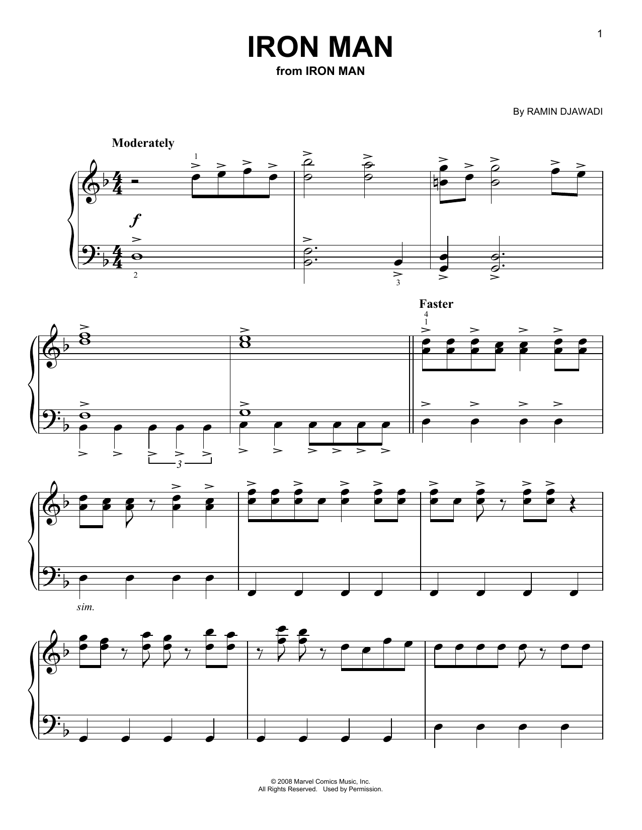 Download or print Ramin Djawadi Iron Man sheet music, chords and digital score arranged for Easy Piano. This Film/TV score includes 3 page(s).