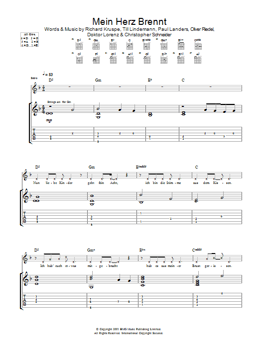Download or print Rammstein Mein Herz Brennt sheet music, chords and digital score arranged for Guitar Tab. This Metal score includes 5 page(s).