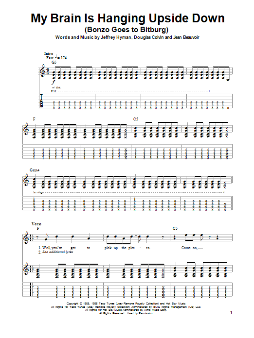 Download or print Ramones My Brain Is Hanging Upside Down (Bonzo Goes To Bitburg) sheet music, chords and digital score arranged for Guitar Tab (Single Guitar). This Pop score includes 8 page(s).