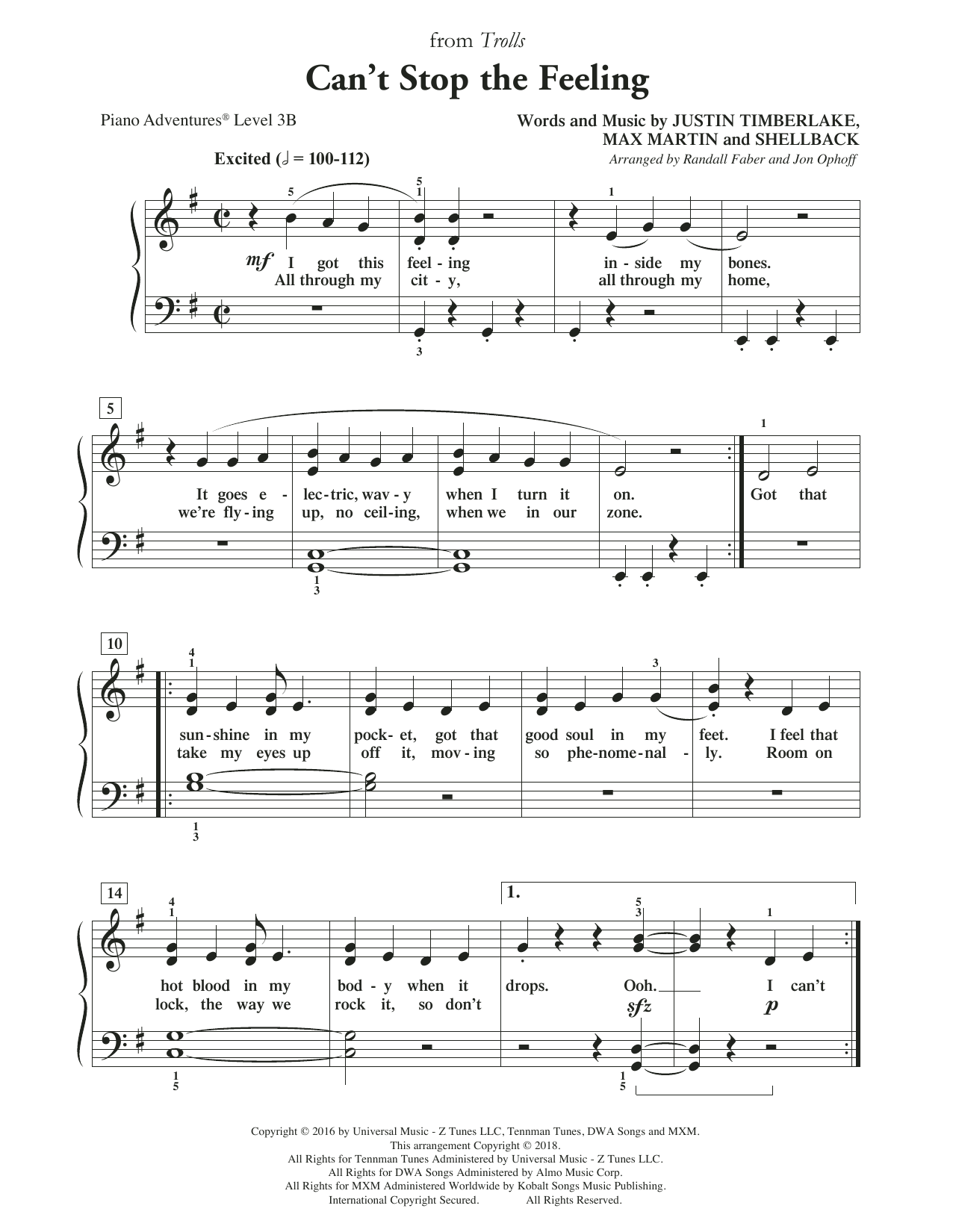 Download or print Randall Faber & Jon Ophoff Can't Stop the Feeling sheet music, chords and digital score arranged for Piano Adventures. This Pop score includes 3 page(s).