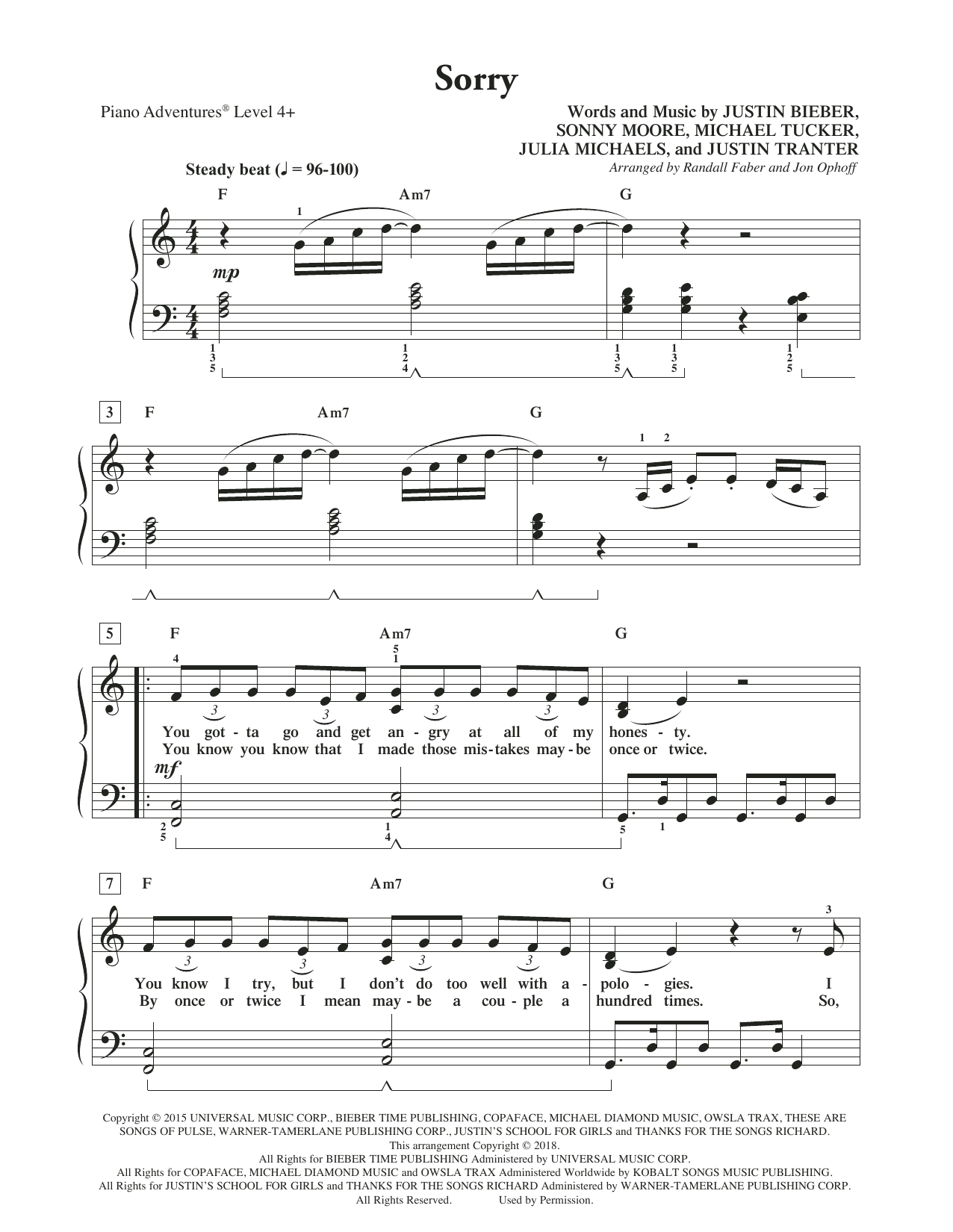 Download or print Randall Faber & Jon Ophoff Sorry sheet music, chords and digital score arranged for Piano Adventures. This Pop score includes 3 page(s).
