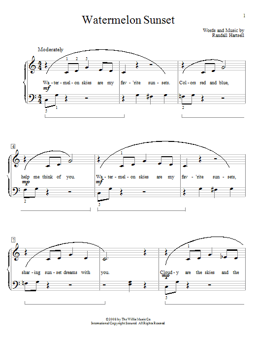 Download or print Randall Hartsell Watermelon Sunset sheet music, chords and digital score arranged for Educational Piano. This Children score includes 3 page(s).