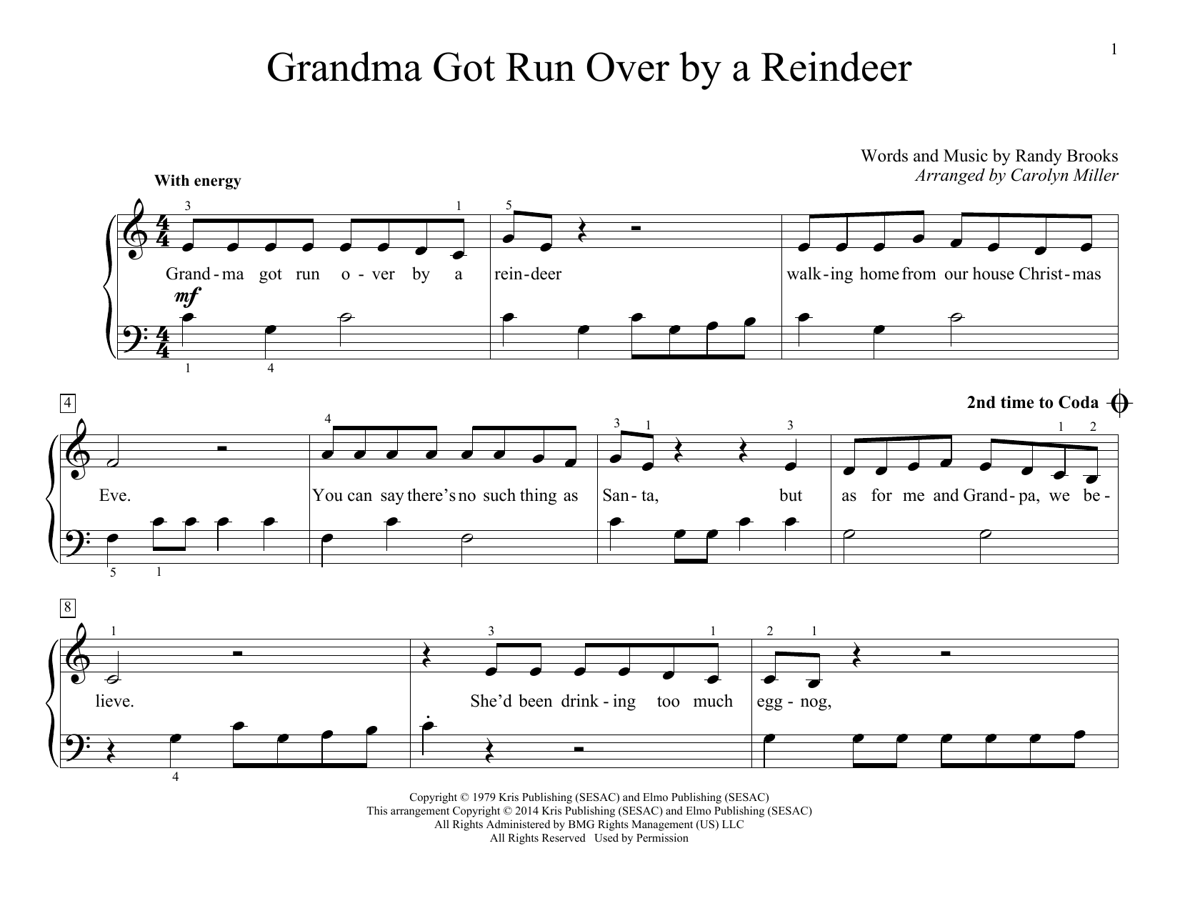 Download or print Carolyn Miller Grandma Got Run Over By A Reindeer sheet music, chords and digital score arranged for Educational Piano. This Children score includes 2 page(s).