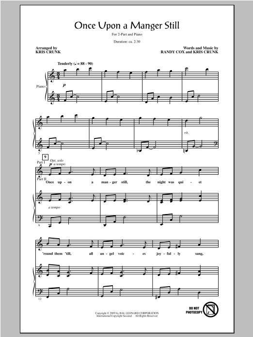 Download or print Kris Crunk Once Upon A Manger Still sheet music, chords and digital score arranged for 2-Part Choir. This Christmas score includes 7 page(s).