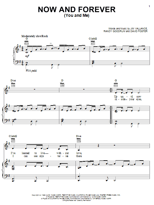 Download or print Randy Goodrum Now And Forever (You And Me) sheet music, chords and digital score arranged for Piano, Vocal & Guitar Chords (Right-Hand Melody). This Country score includes 6 page(s).