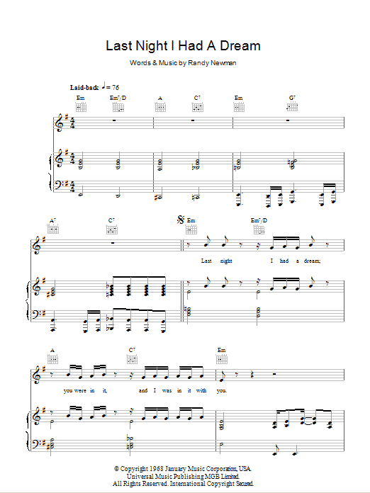 Download or print Randy Newman Last Night I Had A Dream sheet music, chords and digital score arranged for Piano, Vocal & Guitar Chords. This Pop score includes 5 page(s).