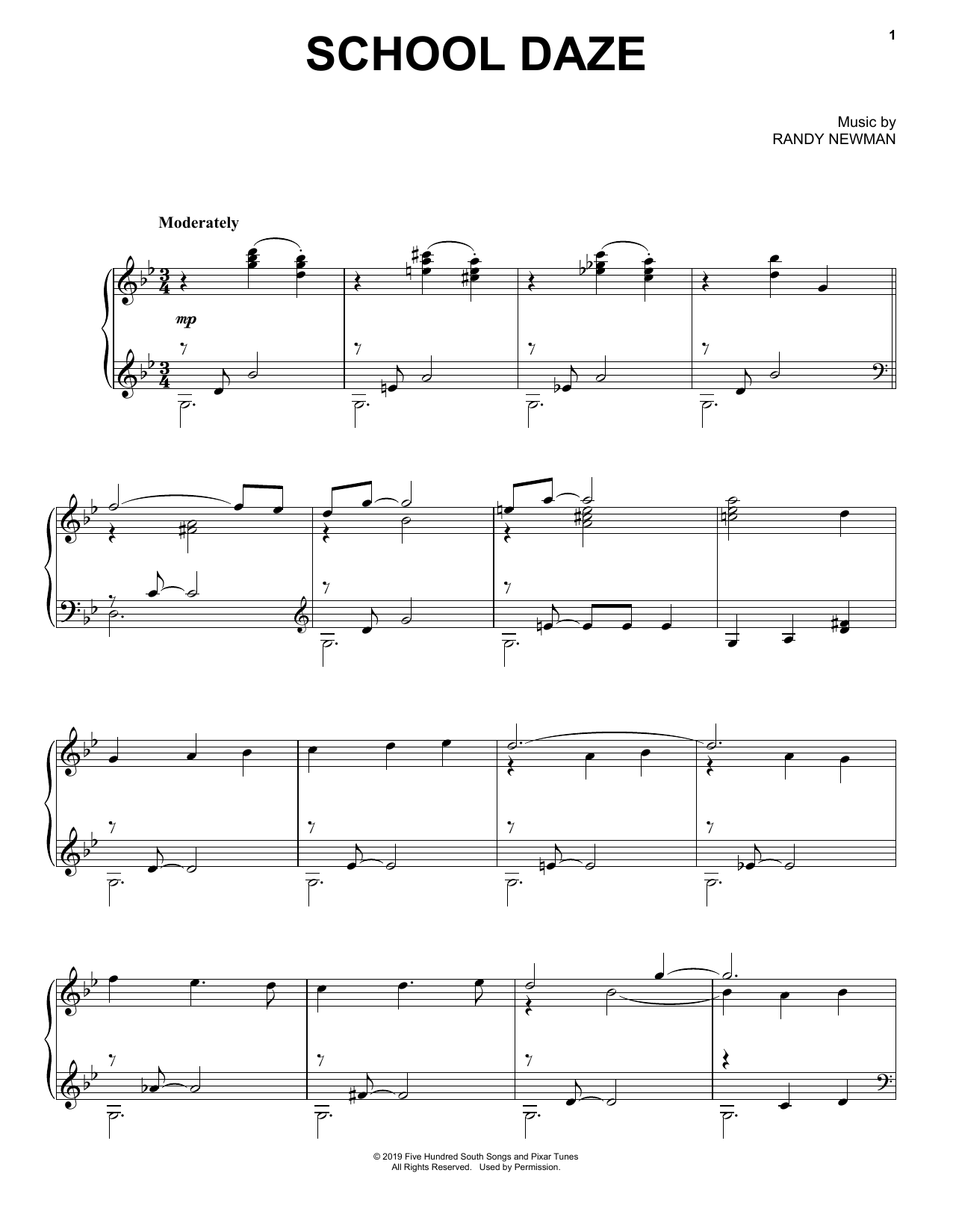Download or print Randy Newman School Daze (from Toy Story 4) sheet music, chords and digital score arranged for Piano Solo. This Disney score includes 3 page(s).