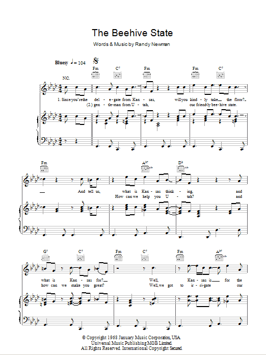 Download or print Randy Newman The Beehive State sheet music, chords and digital score arranged for Piano, Vocal & Guitar Chords. This Standards score includes 4 page(s).